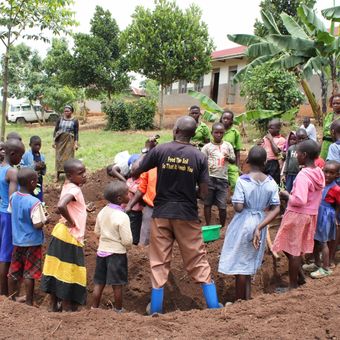 In Uganda, St. Jude Family Projects invests in local food security by teaching children how to feed the soil so it feeds the community. Children are designing circular gardens that look like mandalas. Digging trenches in circular patterns creates interest and also helps the soil retain water.